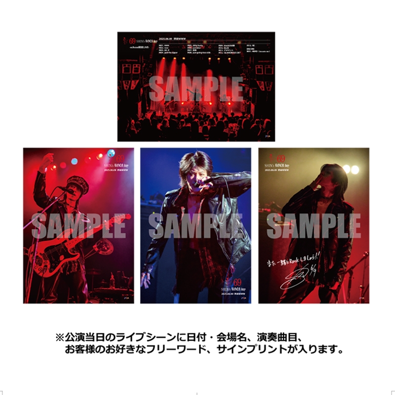 当日のライブシーンのベストショットに日付・会場名、演奏曲目、お客様のお好きなフリーワード等も入るメモリアルフォトカードです。